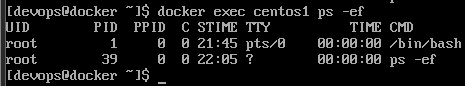 docker exec centos1 ps -ef (그런데 컨테이너 이미지에 따라서 ps 명령어가 설치 안되어있을 수도 있어)