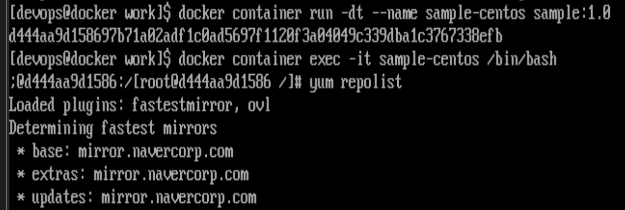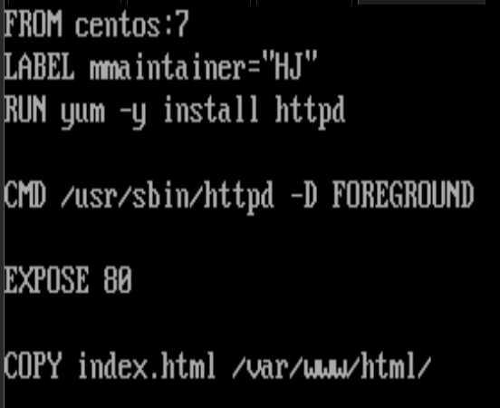 RUN yum install vim -y (프롬프트를 요구하는 명령어의 경우 -y 같은거 입력 안해주면 진행이 안돼)