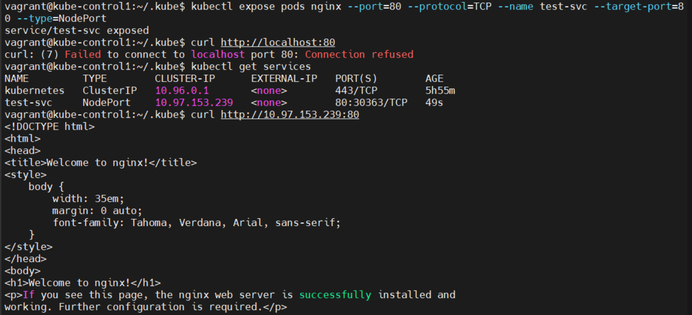 kubectl expose pods nginx --port=80 --protocol=TCP --name test-svc --type=NodePort