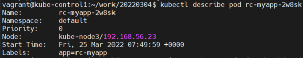 (위에서 확인한 파드 이름을 지정하여) ReplicationController에 속한 파드 상세 정보 확인