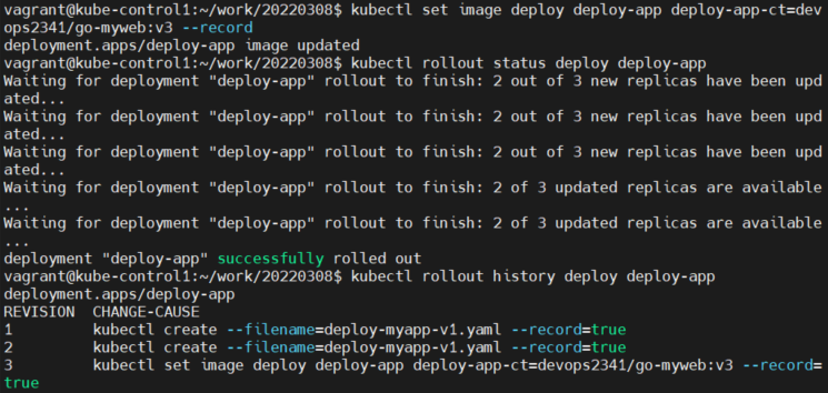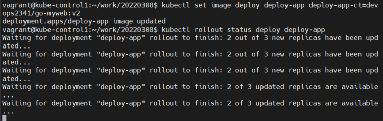 kubectl rollout status deployment DEPLOYMENT_NAME (실시간으로 rollout되는 status가 보임)