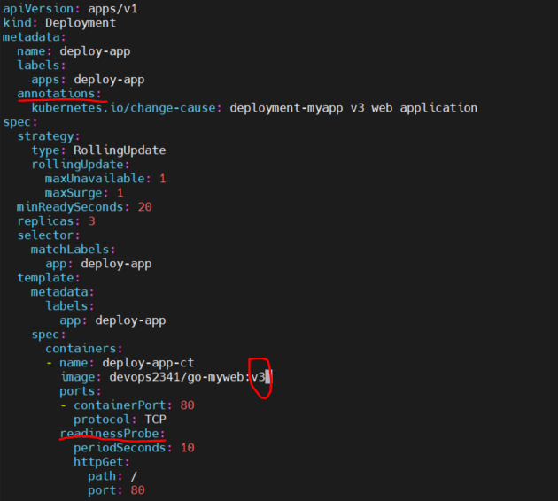 annotation 추가하고 readinessProbe 추가하고, 컨테이너 이미지도 v3으로 버전 업해줄거임