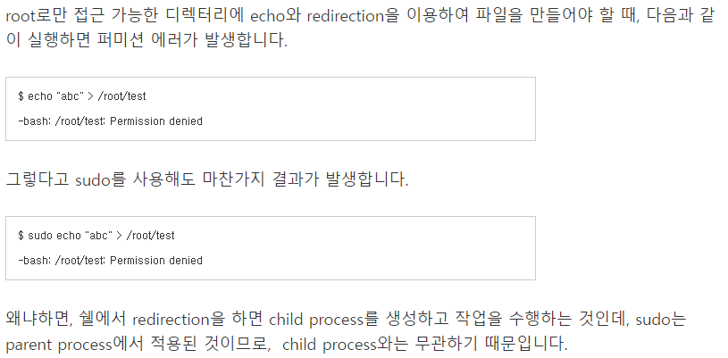 그럴때는, sudo tee라는 명령어를 이용해서 root 권한으로 넘겨주면 된대.