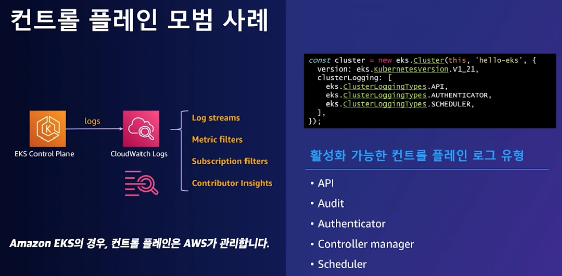 EKS의 경우, 컨트롤 플레인은 AWS가 관리하기 때문에 고객은 API 서버, ETCD 클러스터와 같은 컴포넌트, 혹은 해당 노드들에 대한 운영 버든을 줄일 수 있다.