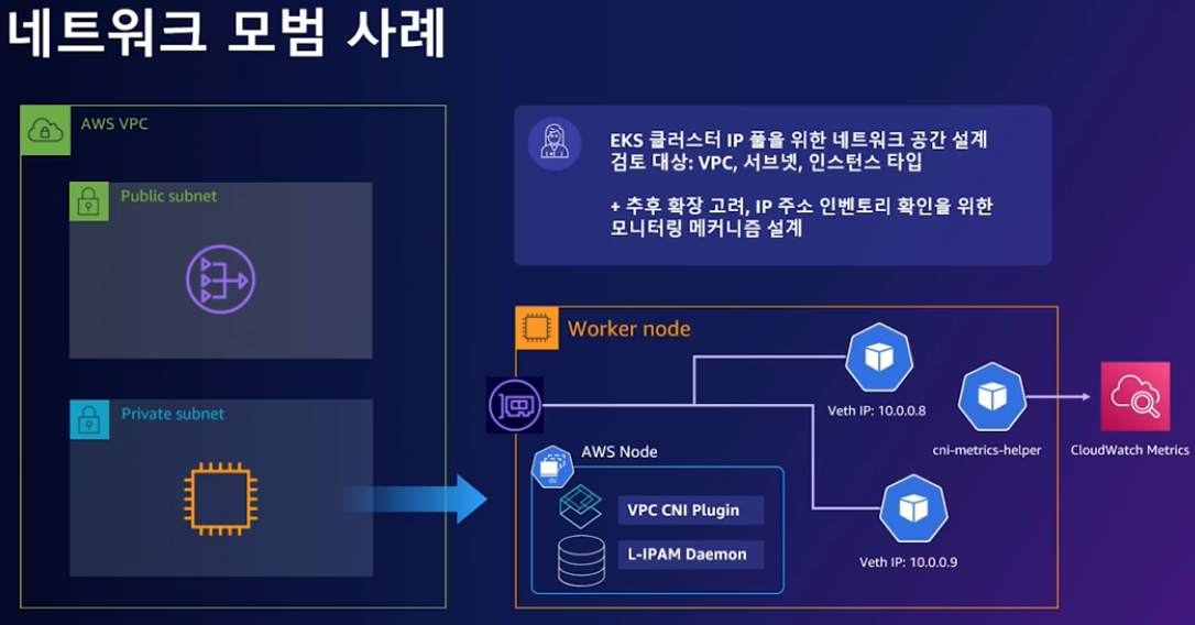 그리고 IP 주소 인벤토리를 확인하기 위해, CNI Metrics Helper와 같은 툴을 사용하면 CloudWatch Alarms를 설정하여 서브넷의 IP 주소가 부족할 경우 알림을 받을 수 있다.