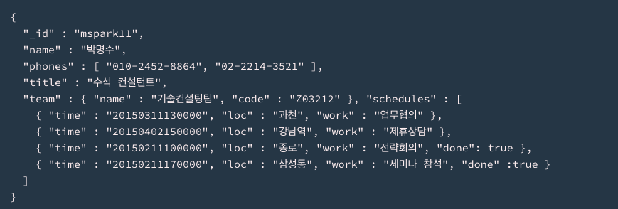 * mongoDB 데이터의 기본 단위는 Document이고, 이는 관계형 데이터베이스의 행과 유사하다.