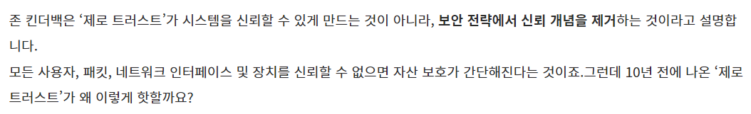 제로 트러스트는 모든 사용자와 패킷, 네트워크 인터페이스 및 장치를 신뢰하지 않는 것이다.