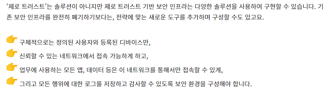 제로 트러스트(zero trust)'는 특정 기술이나 솔루션 이름이 아닙니다. 제로 트러스트는 보안 방법론, 전략, 프레임워크입니다. 사용자나 기기가 네트워크나 데이터에 접근을 요청할 때 처음부터