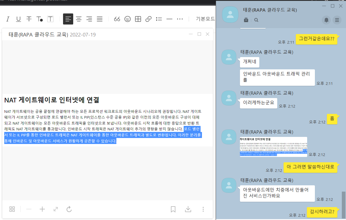 [카톡설명] Nat Gateway의 목적, 서버는 inbound, 클라이언트는 outbound만 열려있어도 데이터를 주고받