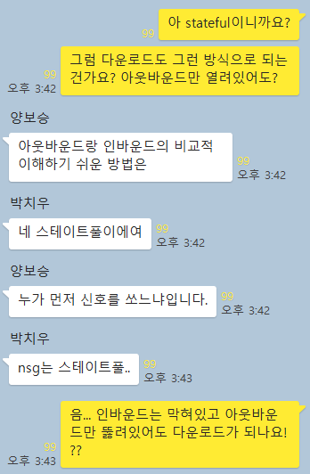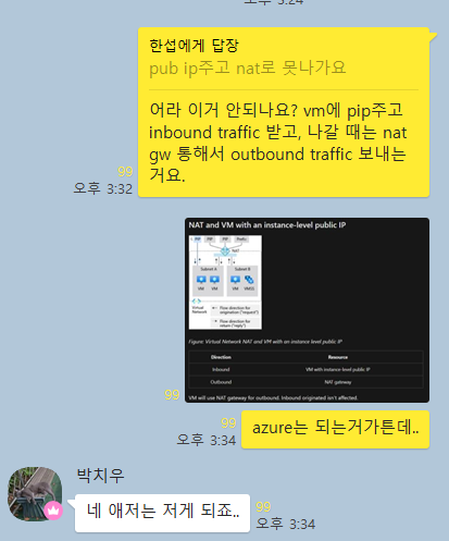 1. 외부(인터넷)에서는 VM에 접근을 못하는데, VM은 NAT gateway를 통해 외부(인터넷)로 나갈 수 있다.