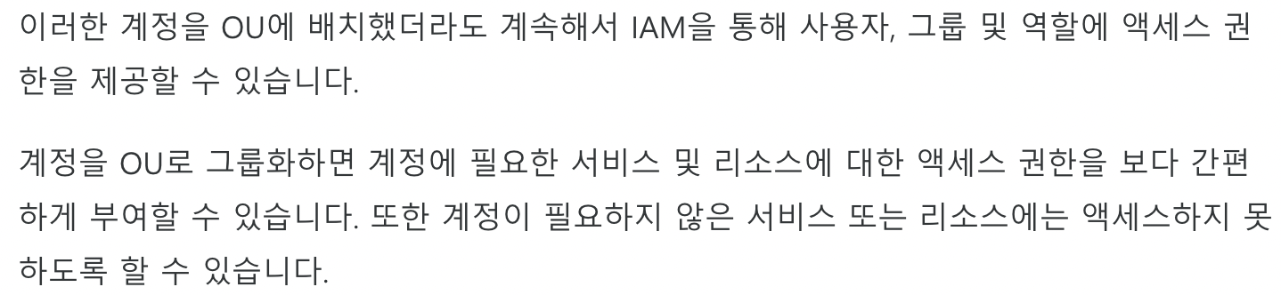 예를 들어 특정 규정 준수 요구 사항을 충족하는 AWS 서비스에만 액세스해야 하는 계정이 있다면 이 계정을 하나의 OU에 넣을 수 있으며 개발자 OU에 해당하는 계정이 있다면 그에 맞게 그룹화하는 식입니다.