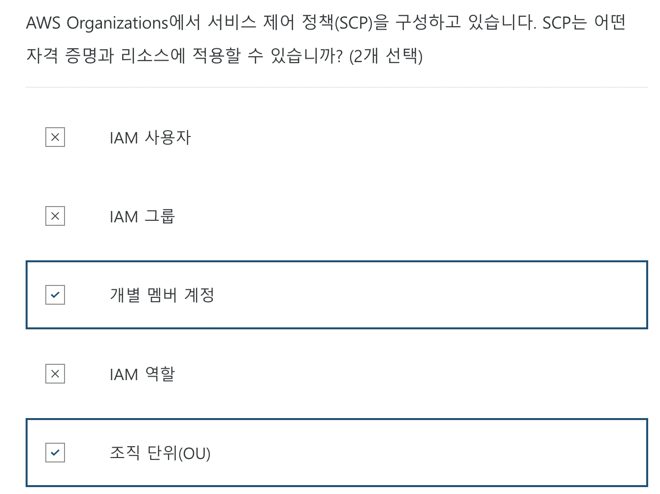 AWS Organizations에서 서비스 제어 정책(SCP)을 조직 루트, 개별 멤버 계정 또는 OU에 적용할 수 있습니다. SCP는 AWS 계정 루트 사용자를 포함하여 계정 내의 모든 IAM 사용자, 그룹 및 역할에 영향을 줍니다.