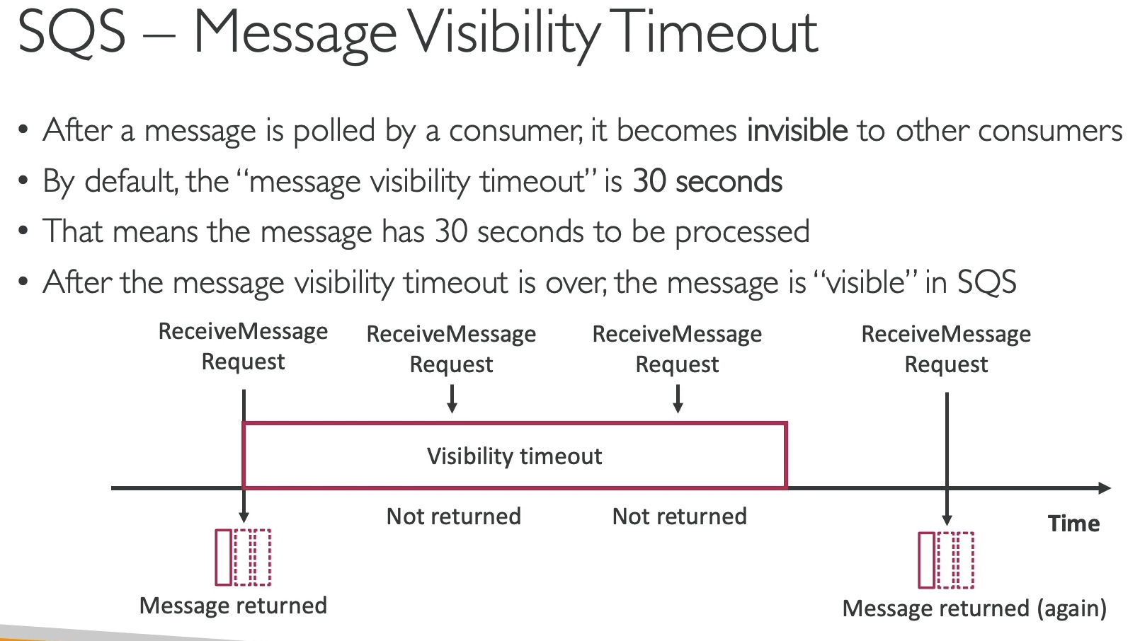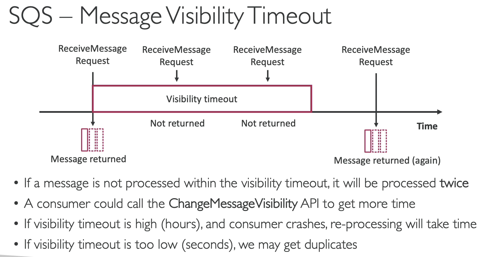 만약에 consumer가 message를 처리할만한 충분한 시간이 없다면, ChangeMessageVisibility API를 호출해야한다.