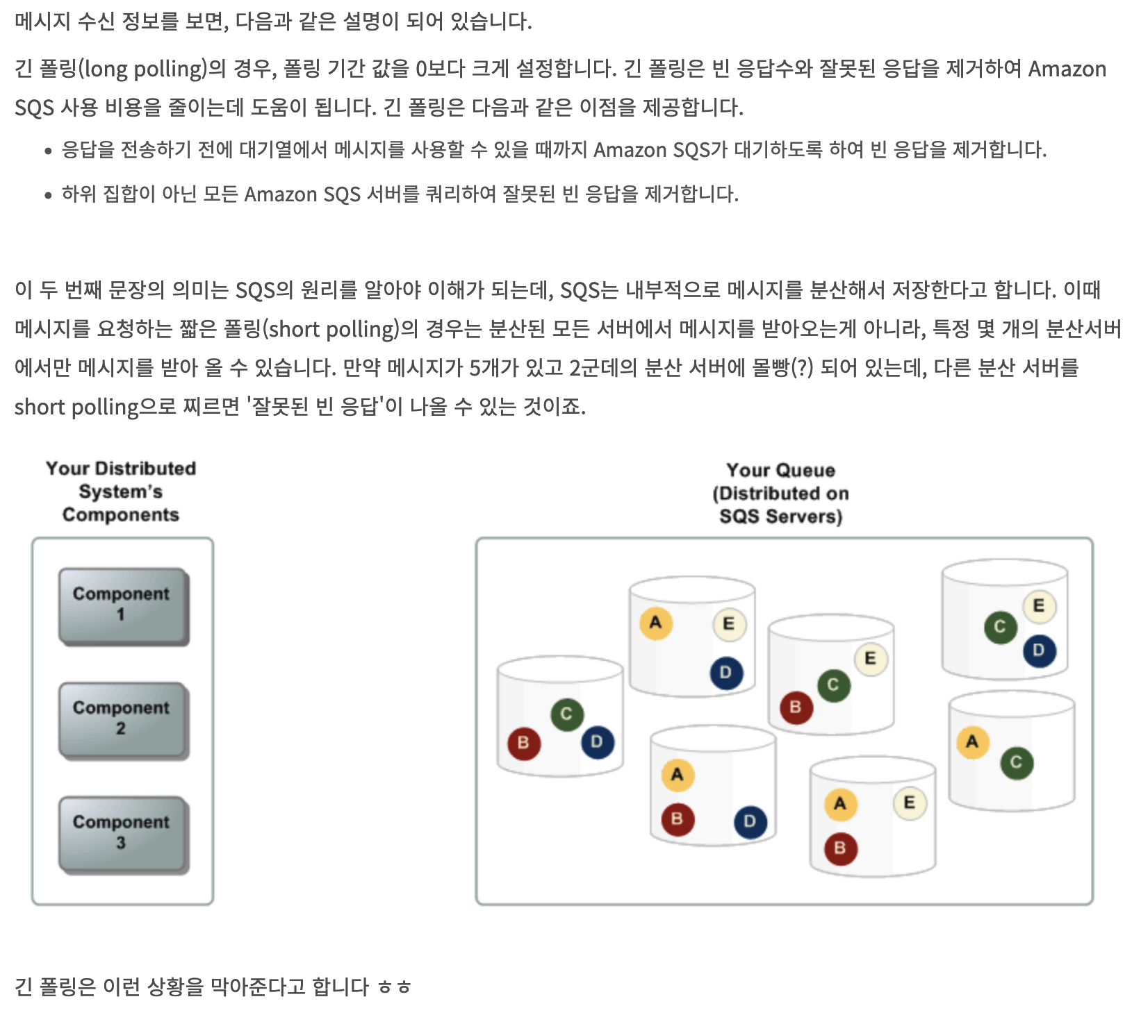 Q) LongPolling이 효율성을 증대시키고 애플리케이션 레이턴시를 줄이면서 SQS에 대한 API 호출의 수를 줄인대.