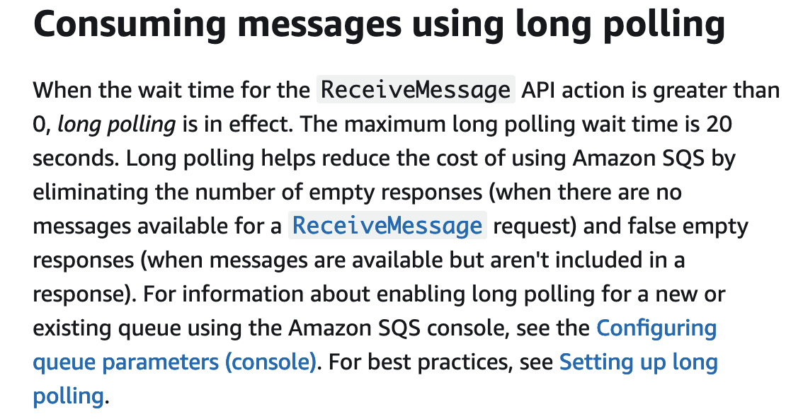 long polling은 메시지가 있으면 바로 큐에서 메시지 가져오는거고, 큐에서 메시지 없으면 도착할 때까지 일정 시간 기다리는거