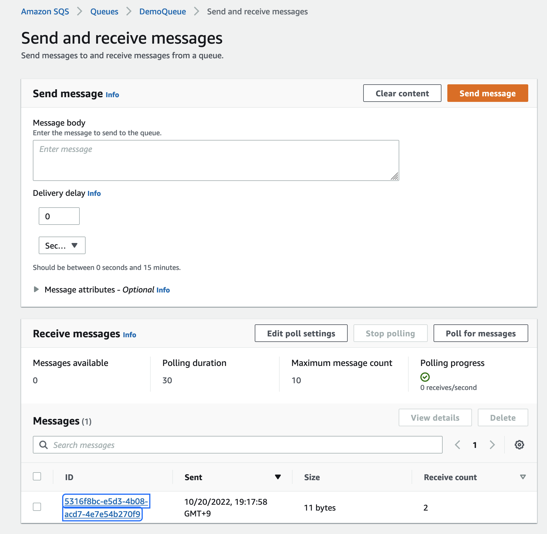 Receive count가 2인 이유는, consumer가 메시지를 받은 후에 processing을 정해진 시간 (polling duration) 안에 해야되는데