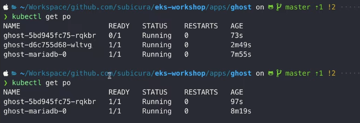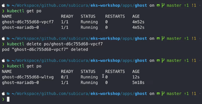 신기하게도, po/ghost-d6c755d68-vpcf7 대신에 ghost-d6c755d68-wltvg라는게 새로 생긴걸 알 수 있다.