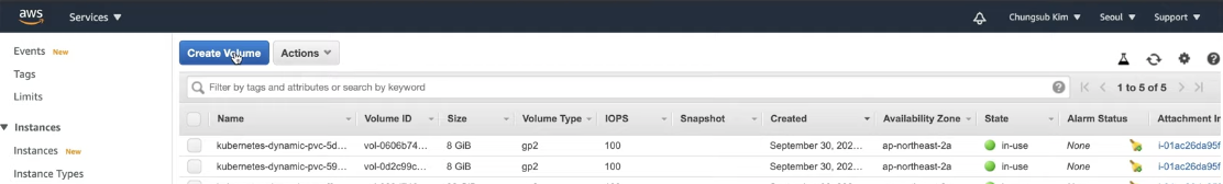 쿠버네티스에서 install만 했는데, aws에서 자동으로 볼륨까지 생성하고 마운트까지 됨