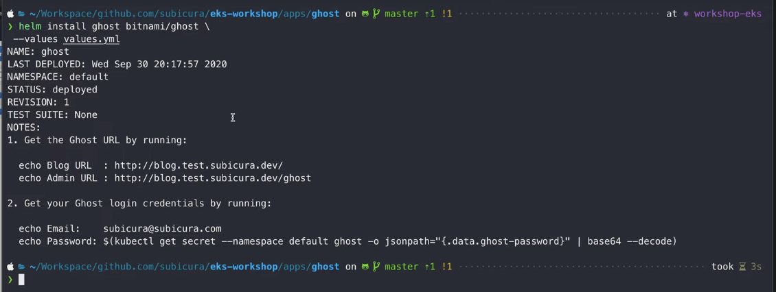 helm install ghost bitnami/ghost \ --values values.yml