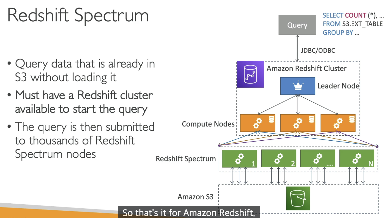 Amazon Redshift Spectrum을 사용하면 데이터를 Amazon Redshift 테이블에 로드하지 않고도 Amazon S3의 파일에서 정형 및 비정형 데이터를 효율적으로 쿼리하고 가져올 수 있습니다. Redshift Spectrum 쿼리는 대량 병렬 처리를 채택해 큰 데이터 집합에 대해 매우 빠르게 실행됩니다. 대부분의 처리가 Redshift Spectrum 계층에서 이루어지며, 데이터가 대부분 Amazon S3에 그대로 남습니다. 또한 다수의 클러스터가 Amazon S3의 동일한 데이터 집합에 대해 동시에 쿼리를 실행할 수 있기 때문에 각 클러스터의 데이터를 일일이 복사할 필요가 없습니다.