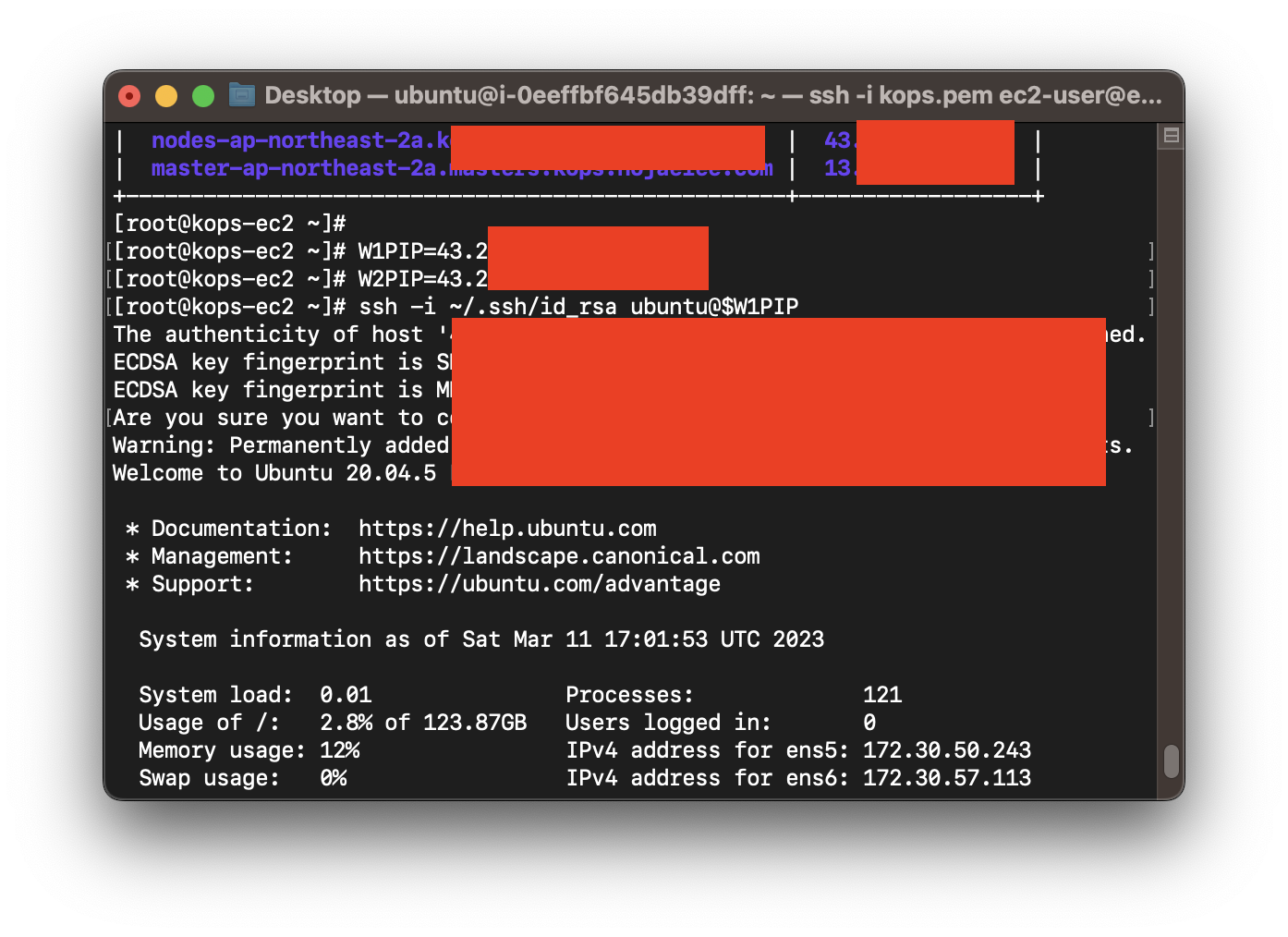 이런 방식으로 워커 노드에 접근을 했고, 접속이 잘 된 것을 확인할 수 있다.
