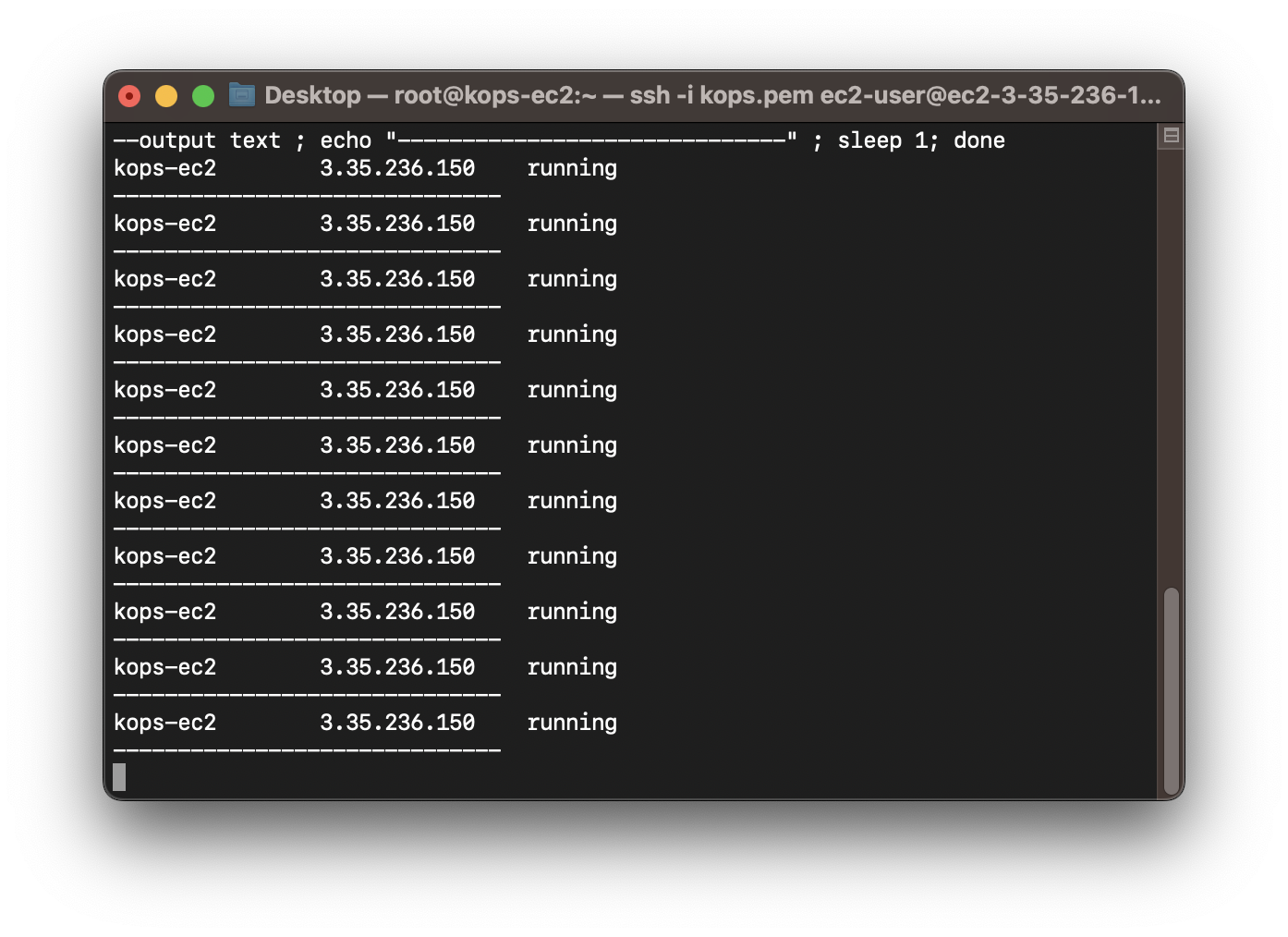 while true; do aws ec2 describe-instances --query "Reservations[*].Instances[*].{PublicIPAdd:PublicIpAddress,InstanceName:Tags[?Key=='Name']|[0].Value,Status:State.Name}" --filters Name=instance-state-name,Values=running --output text ; echo "------------------------------" ; sleep 1; done