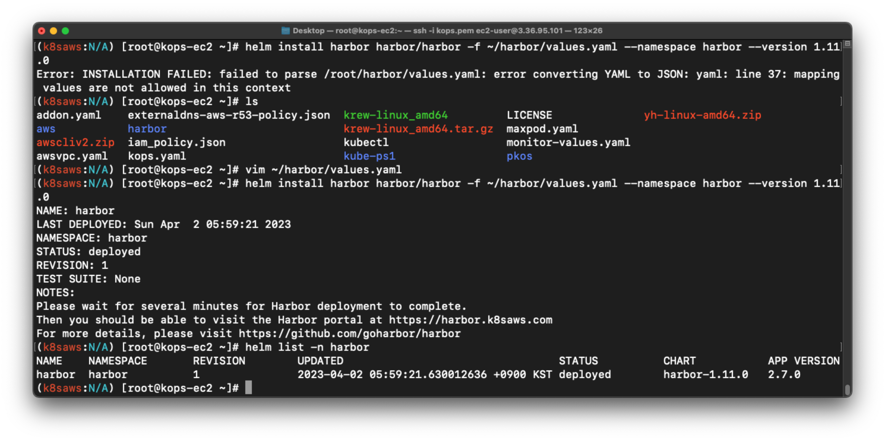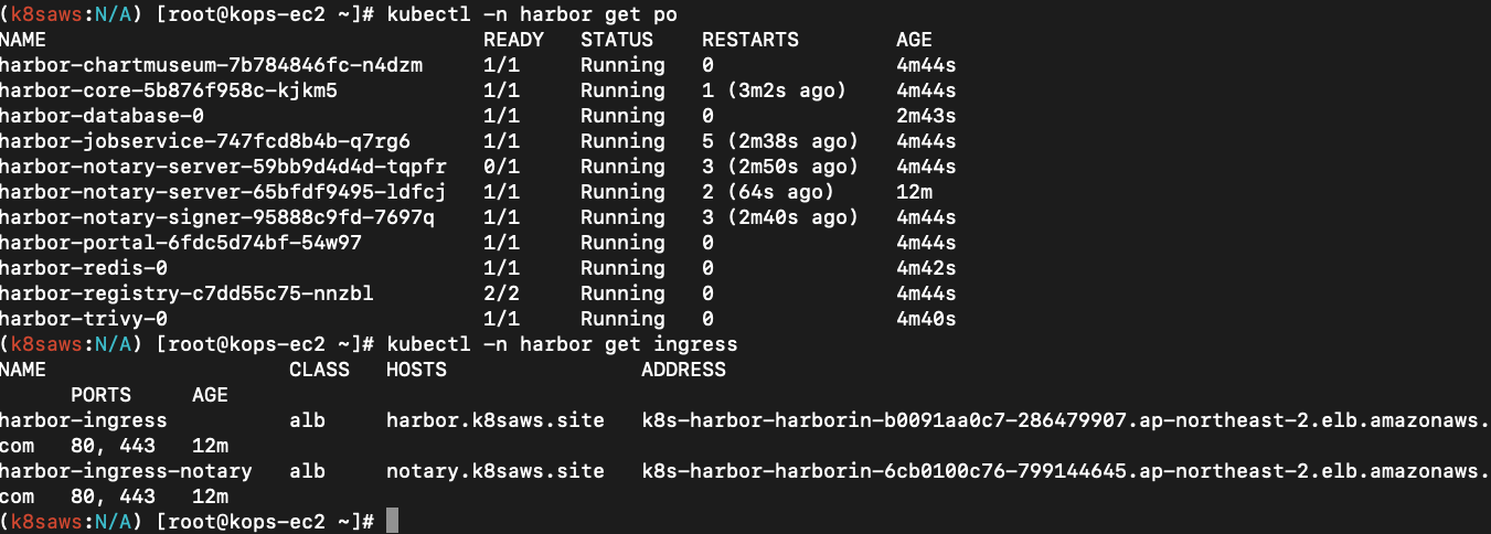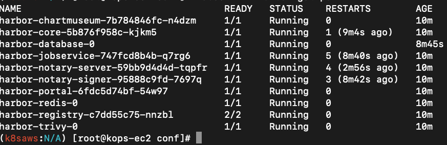 실수가 두 군데 있었는데, certSource=none 안바꾼 것, externalURL을 harbor.k8saws.com으로 한 것 이 두 가지였다.