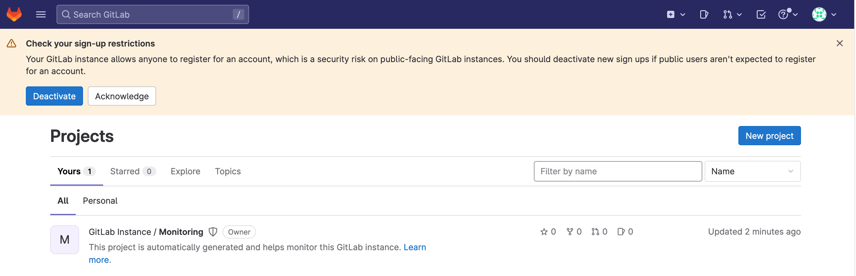 # 웹 접속 https://gitlab.<각자 자신의 도메인> (root / 웹 root 계정 암호)