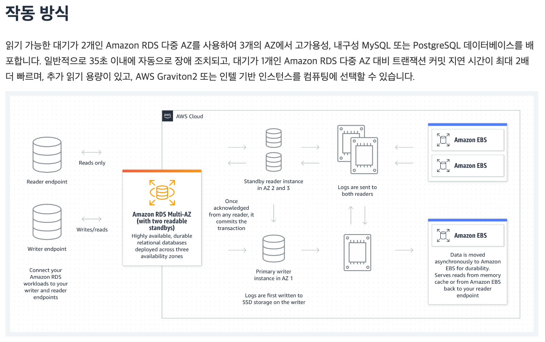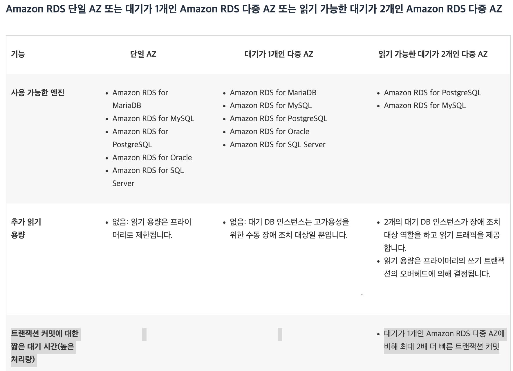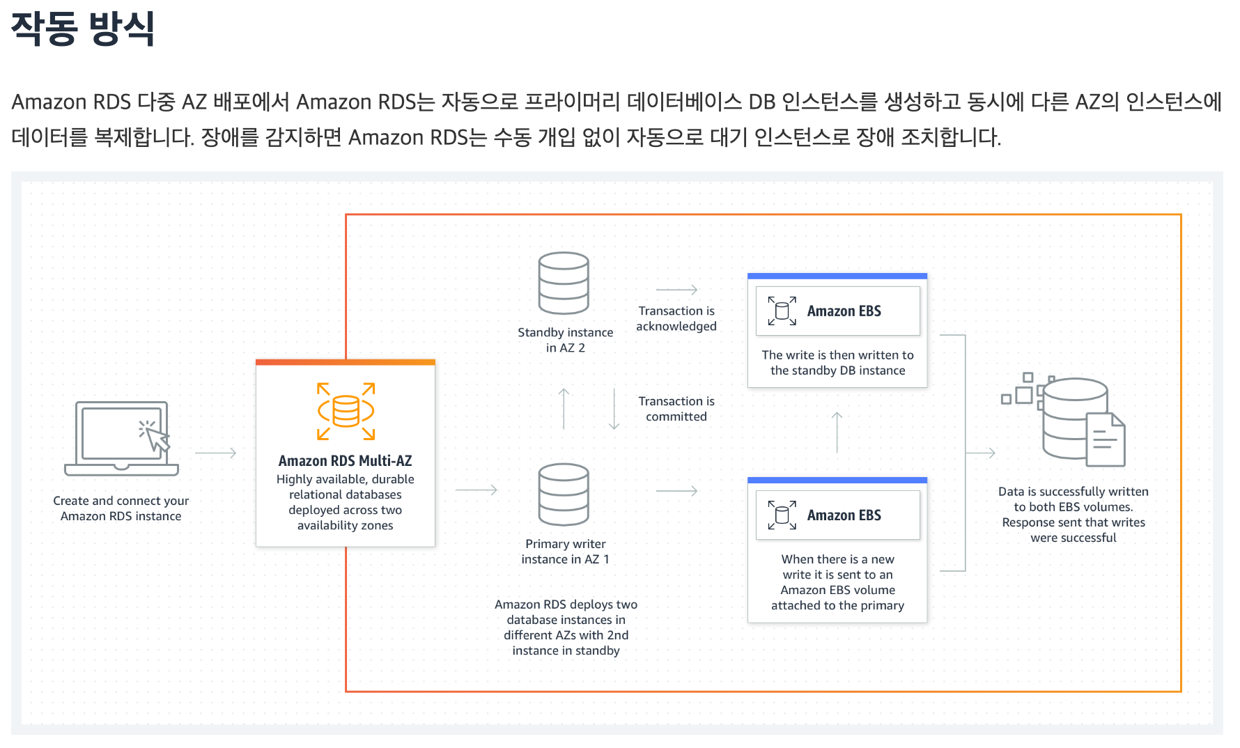 - 두 번째 AZ에 대기 인스턴스를 배포해서 가용성을 높이고, AZ 또는 데이터베이스 인스턴스 장애 발생 시 내결함서 확보.