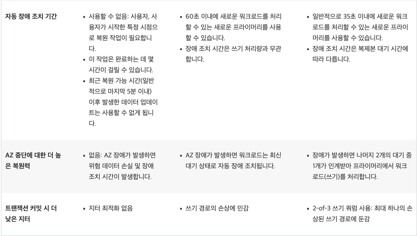 - 데이터 손실 없고, 수동 개입 없이 60초 이내에 failover 완료