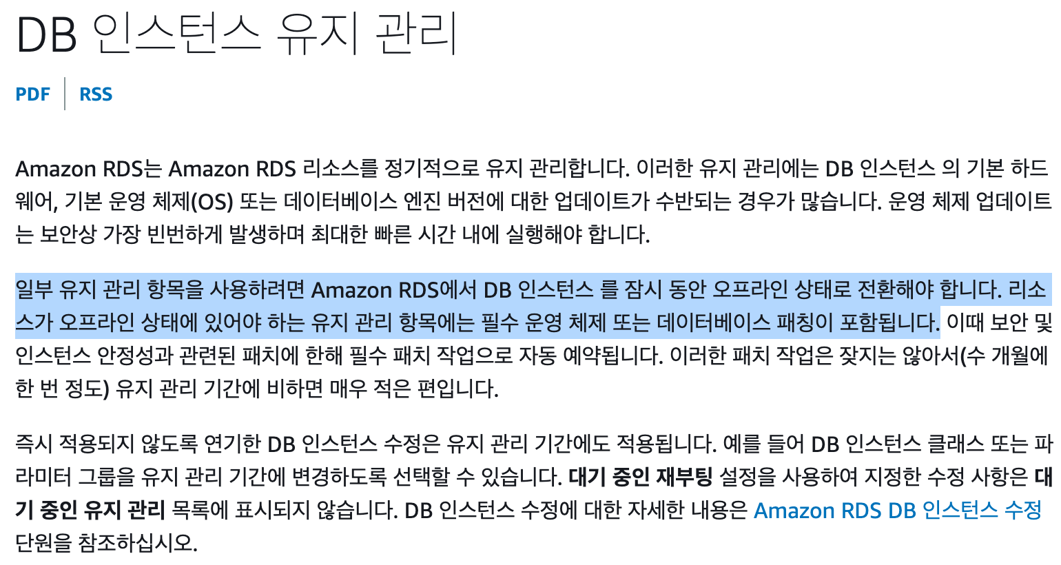 Multi-AZ로 하면 유지보수 기간이 더 줄어들음. 업데이트 보류도 가능.