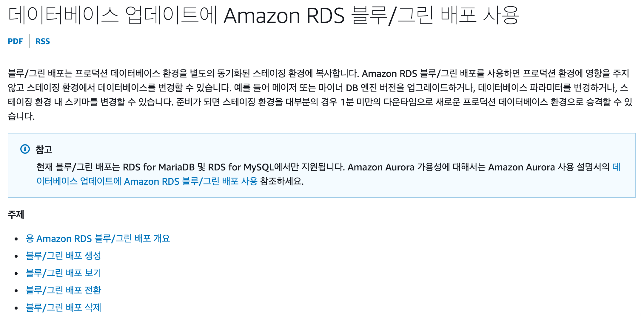Amazon RDS 블루/그린 배포 -> 1분까지 줄어들음. (MariaDB와 MySQL만 지원)