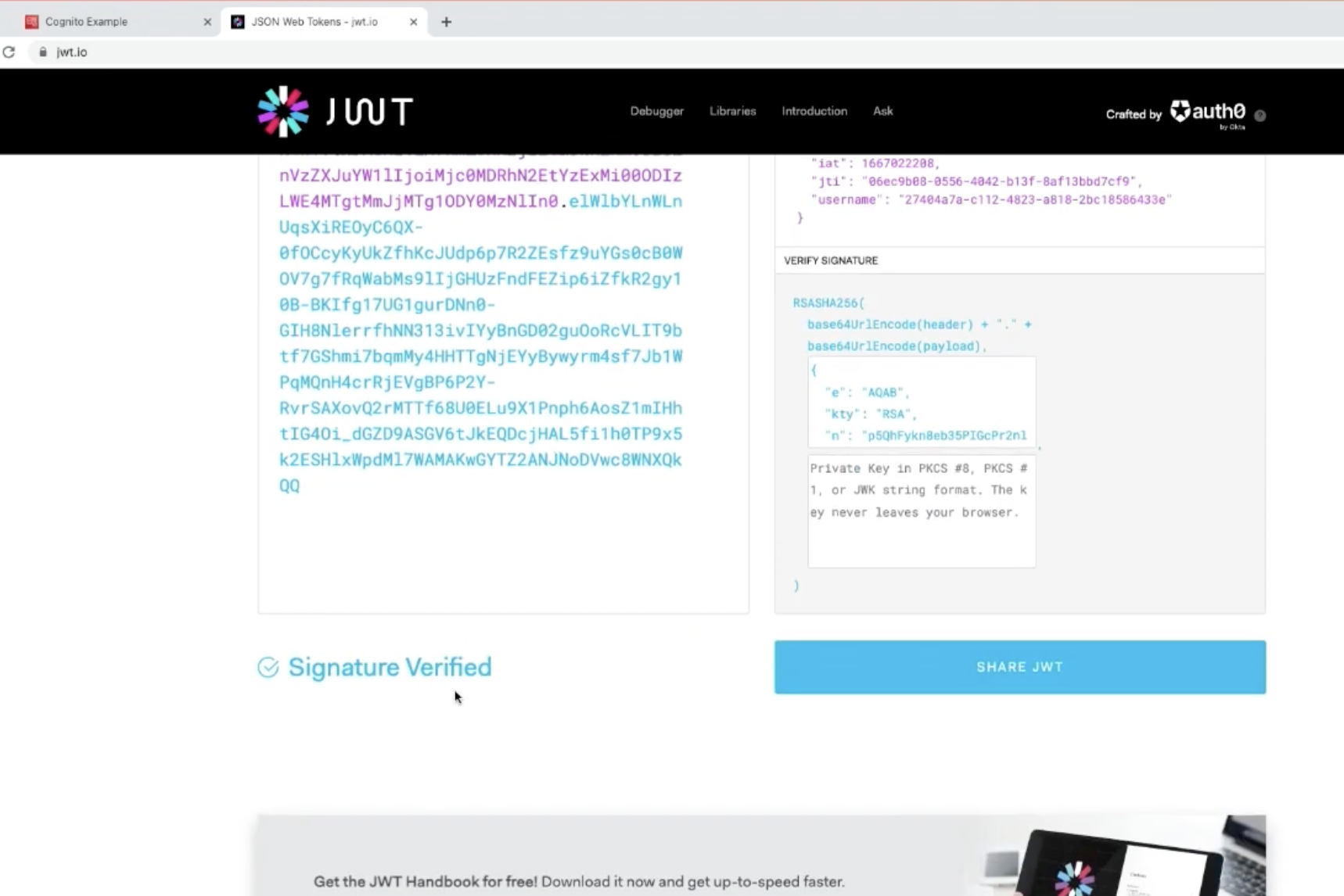 jwt : 개인키로 서명하고 공개키를 통해서 서명된게 유효하고 jwt 페이로드가 변경되지 않았는지 검증