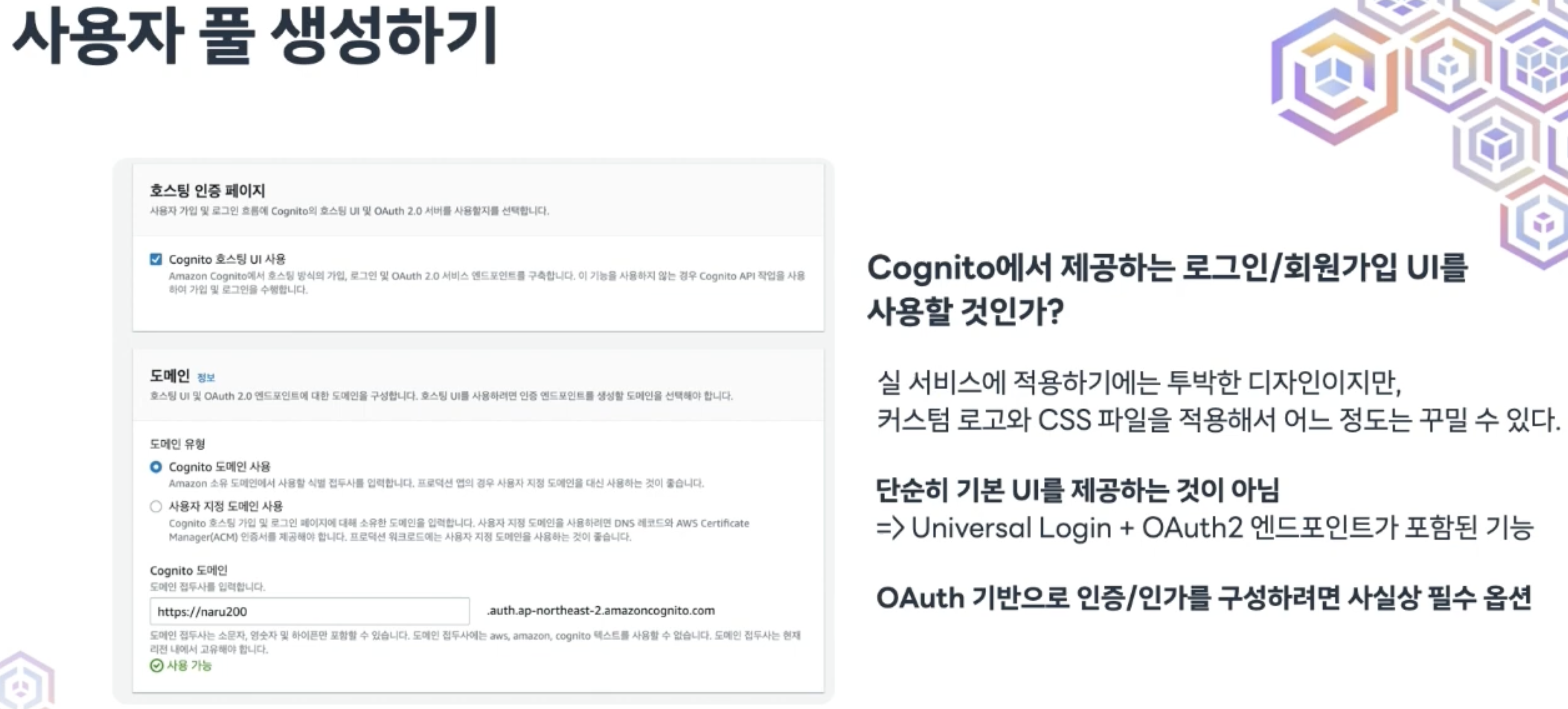 Cognito에서 제공하는 로그인/회원가입 UI 사용할 것인지에 대한 옵션