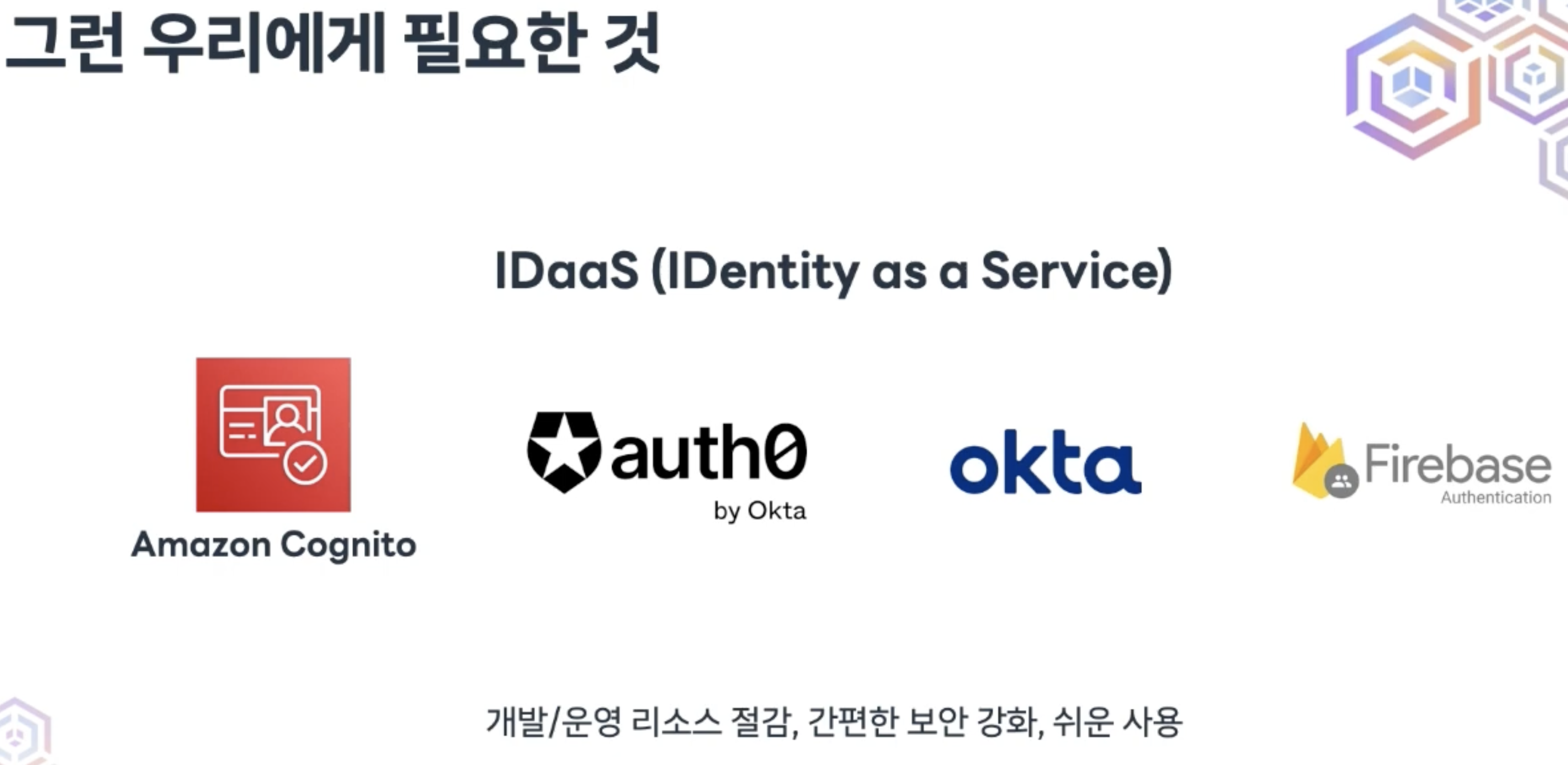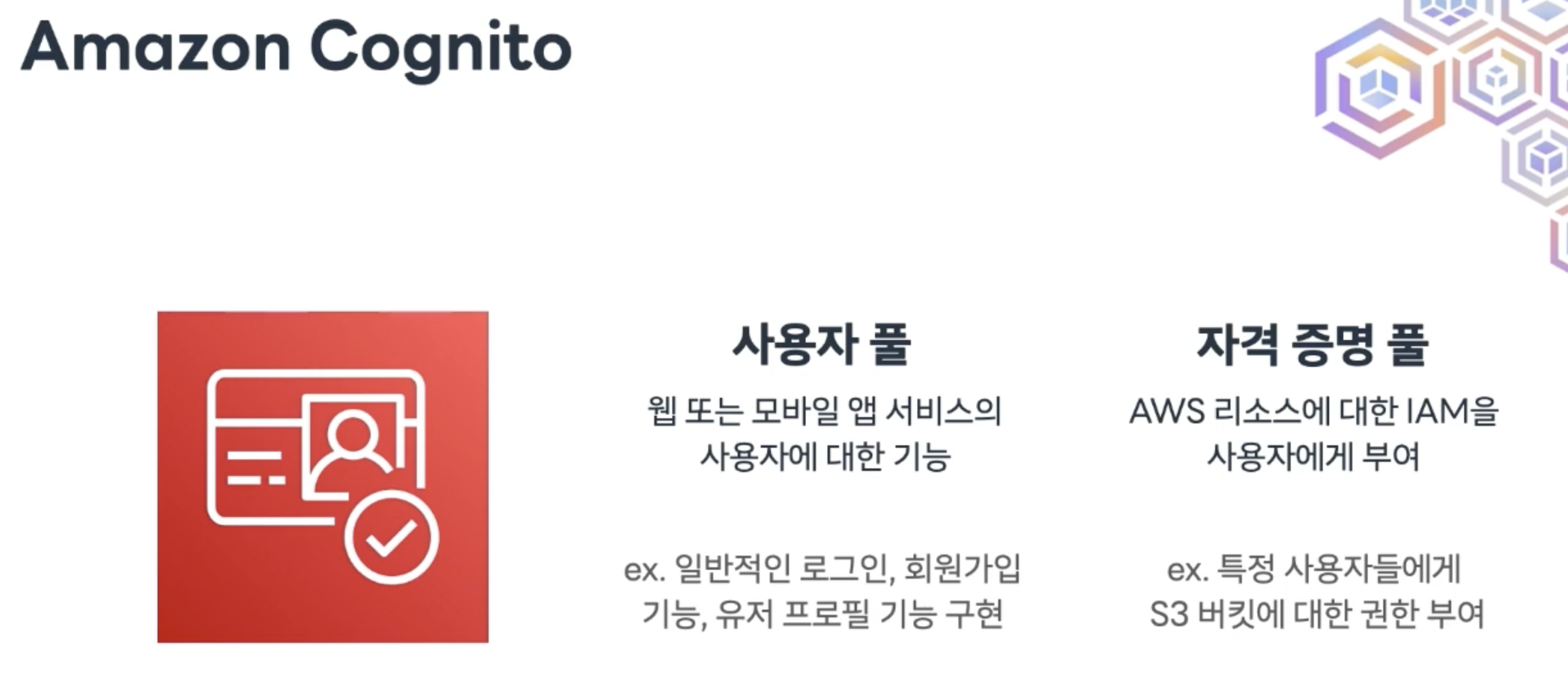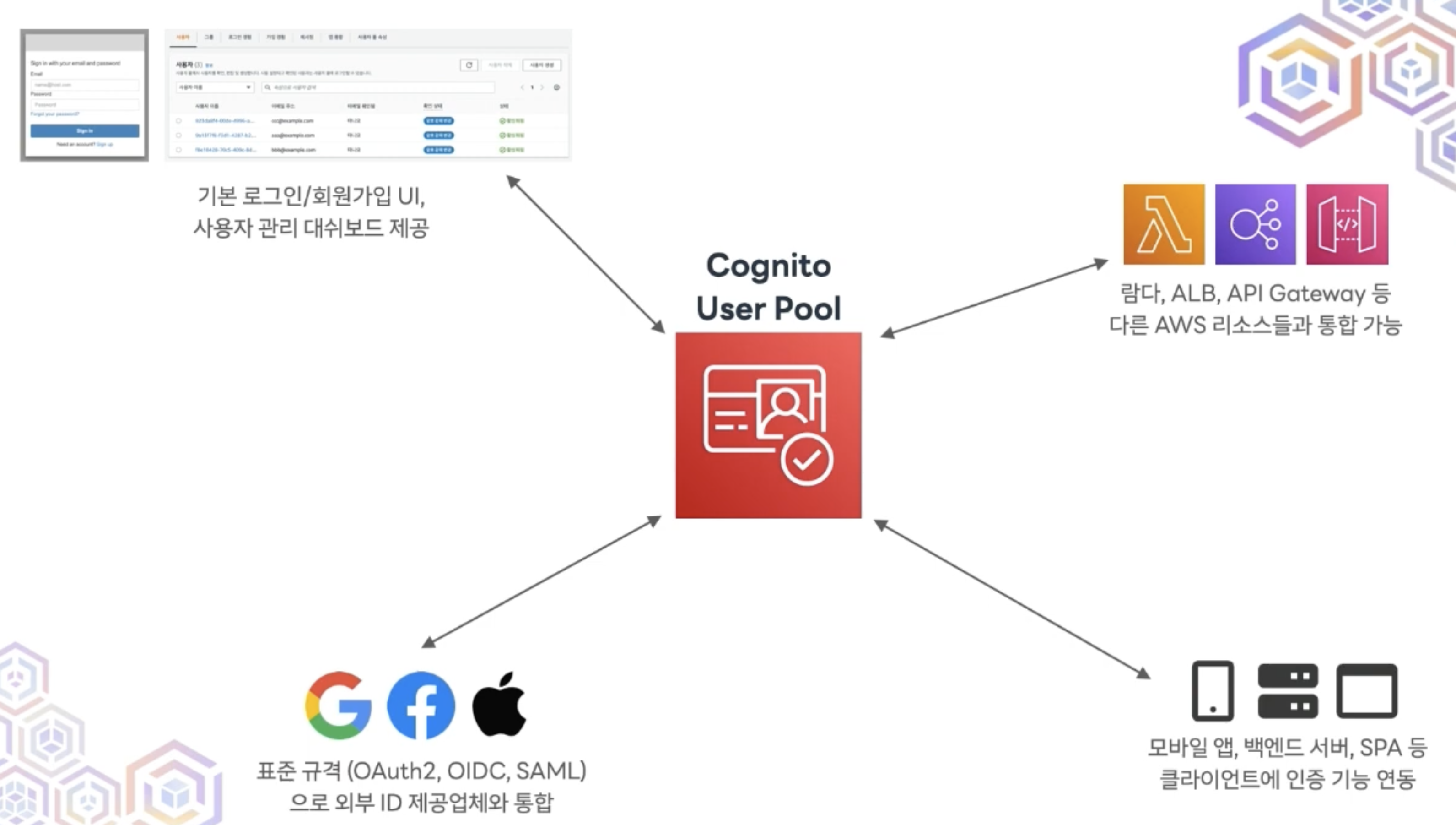 2. AWS 리소스와 통합 가능. (cognito에서 람다 trigger 쏴줄 수 있음)