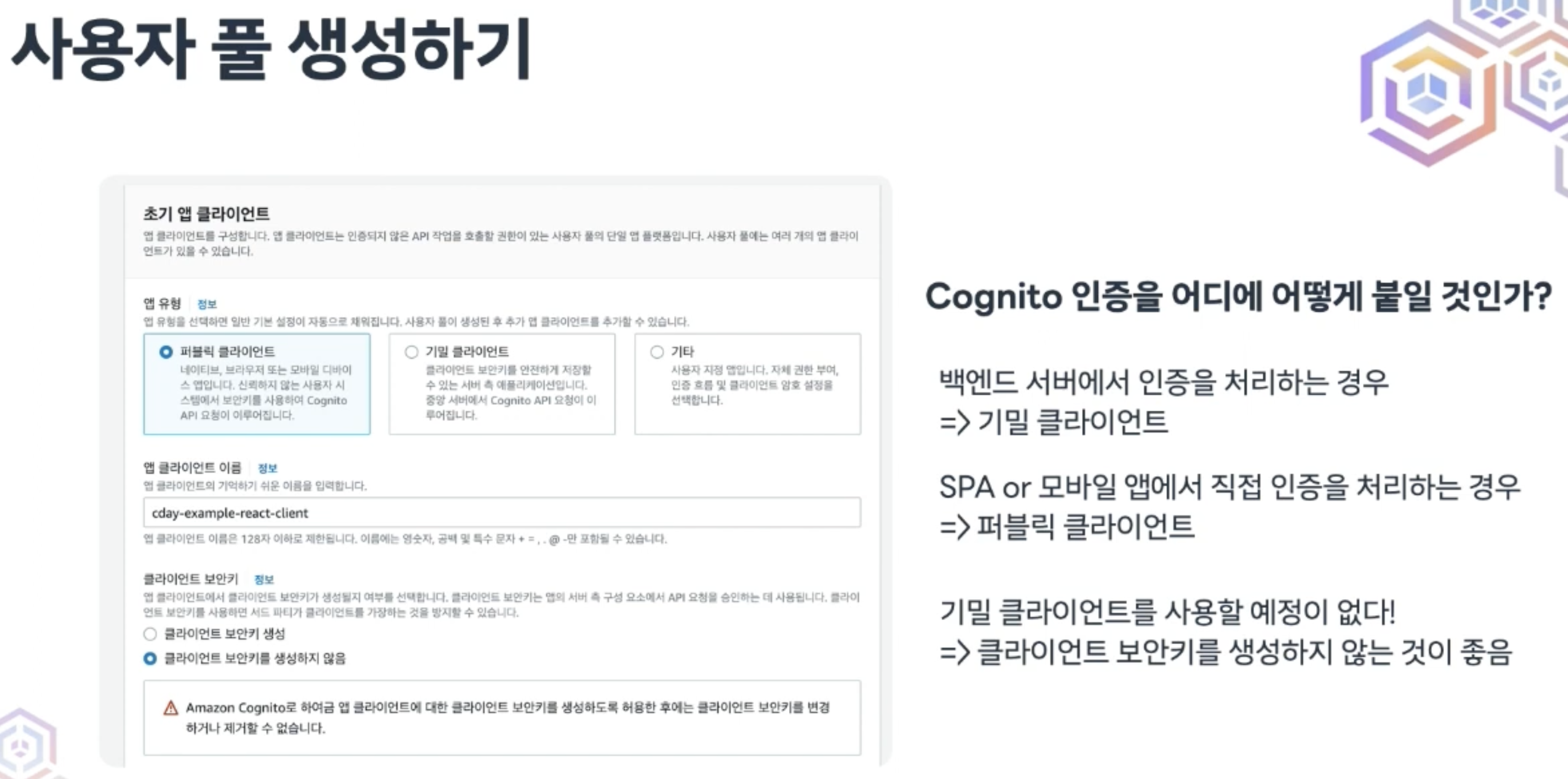 퍼블릭 클라이언트 : 브라우저 환경에서는 안전하게 저장 불가. = 애초에 Secret Key를 안만드는게 나음.