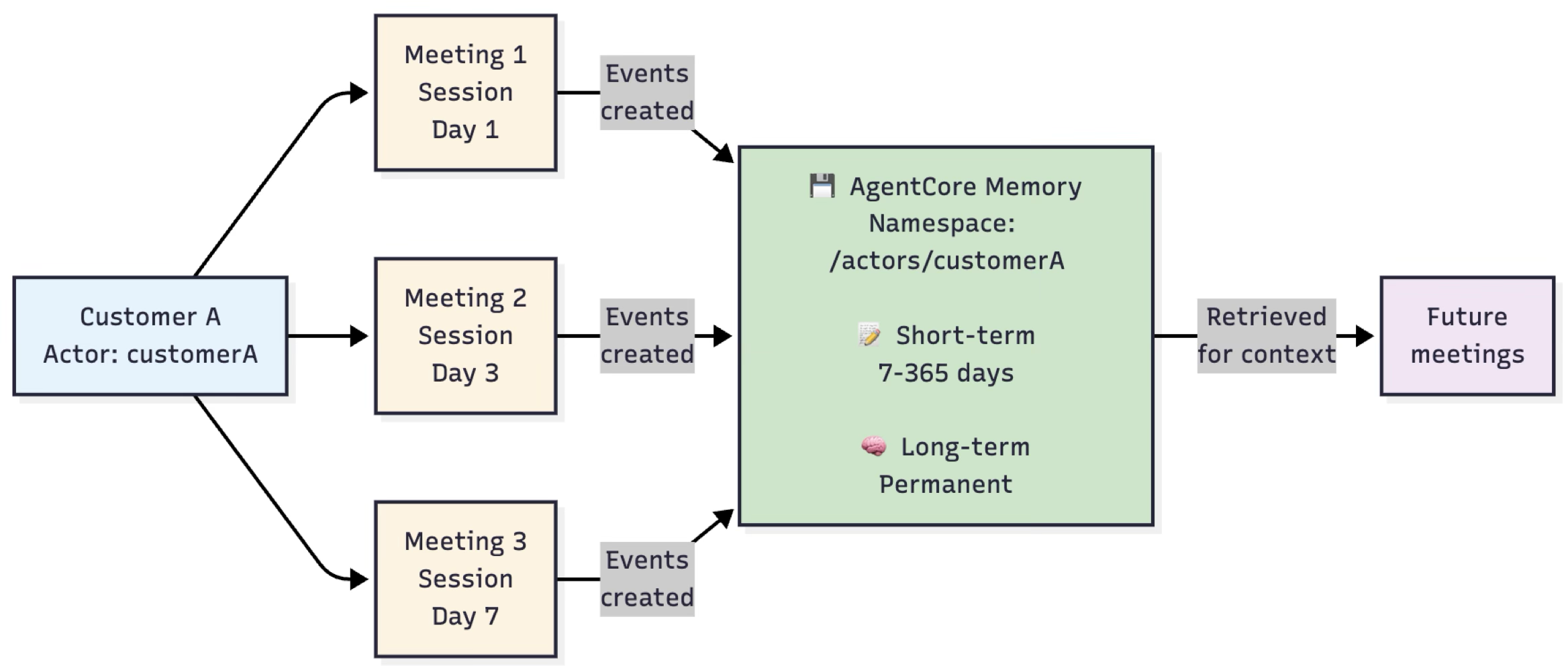 Runtime은 각 세션(미팅)을 물리적으로 완전히 격리하고, Memory는 Actor ID(고객) 아래 여러 세션(미팅)을 계층적으로 조직화해서 컨텍스트를 일관되게 유지하는군요.