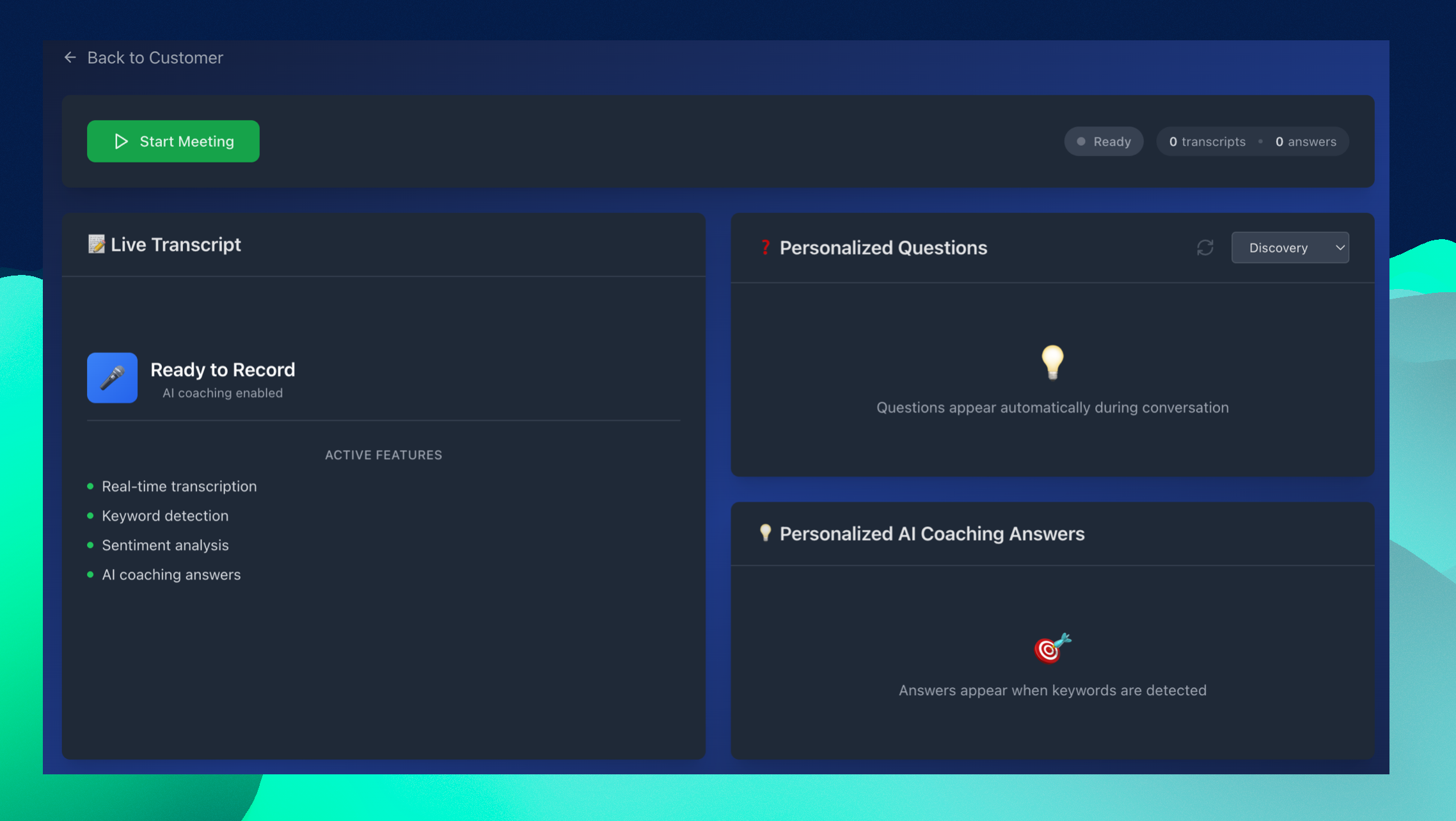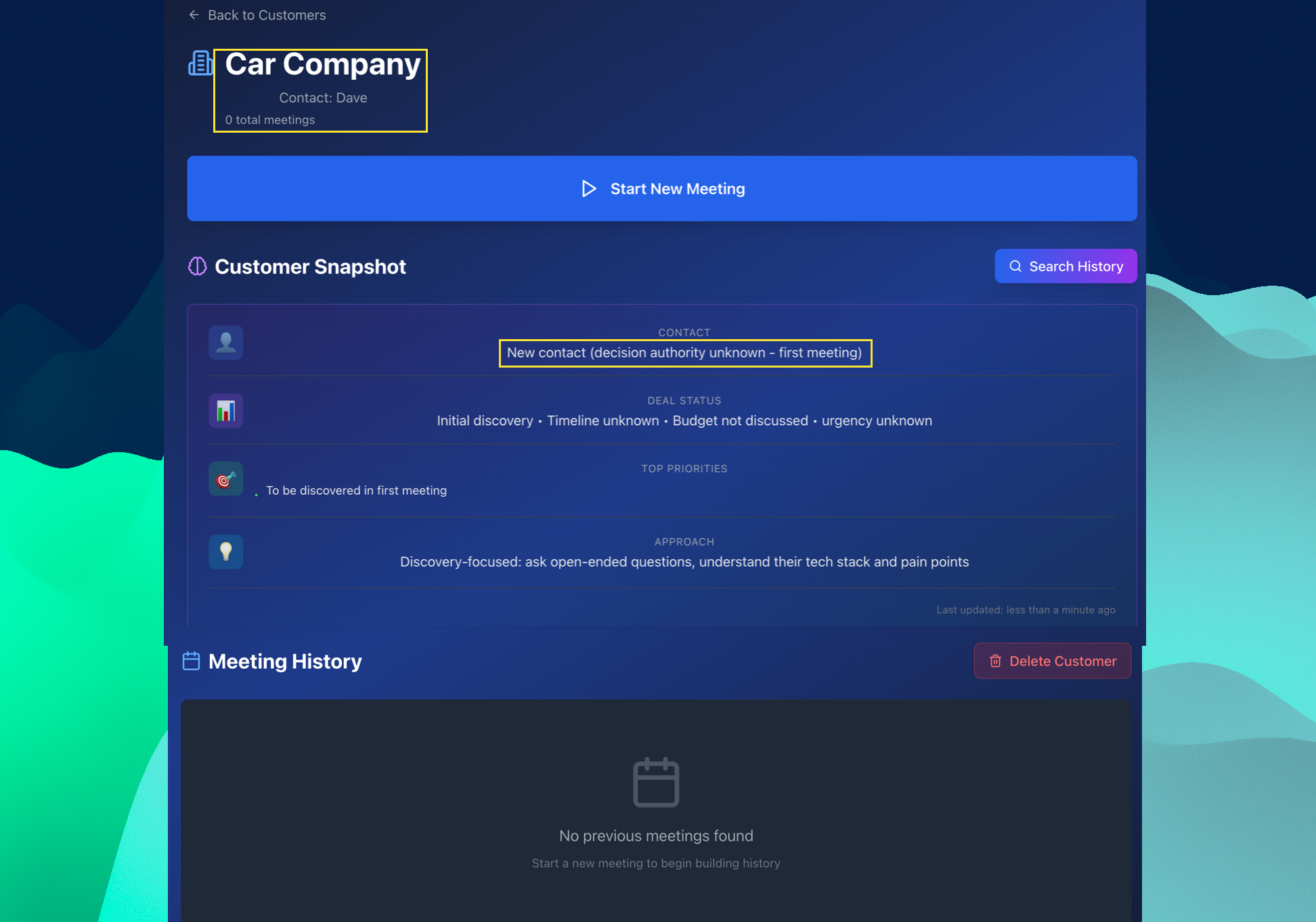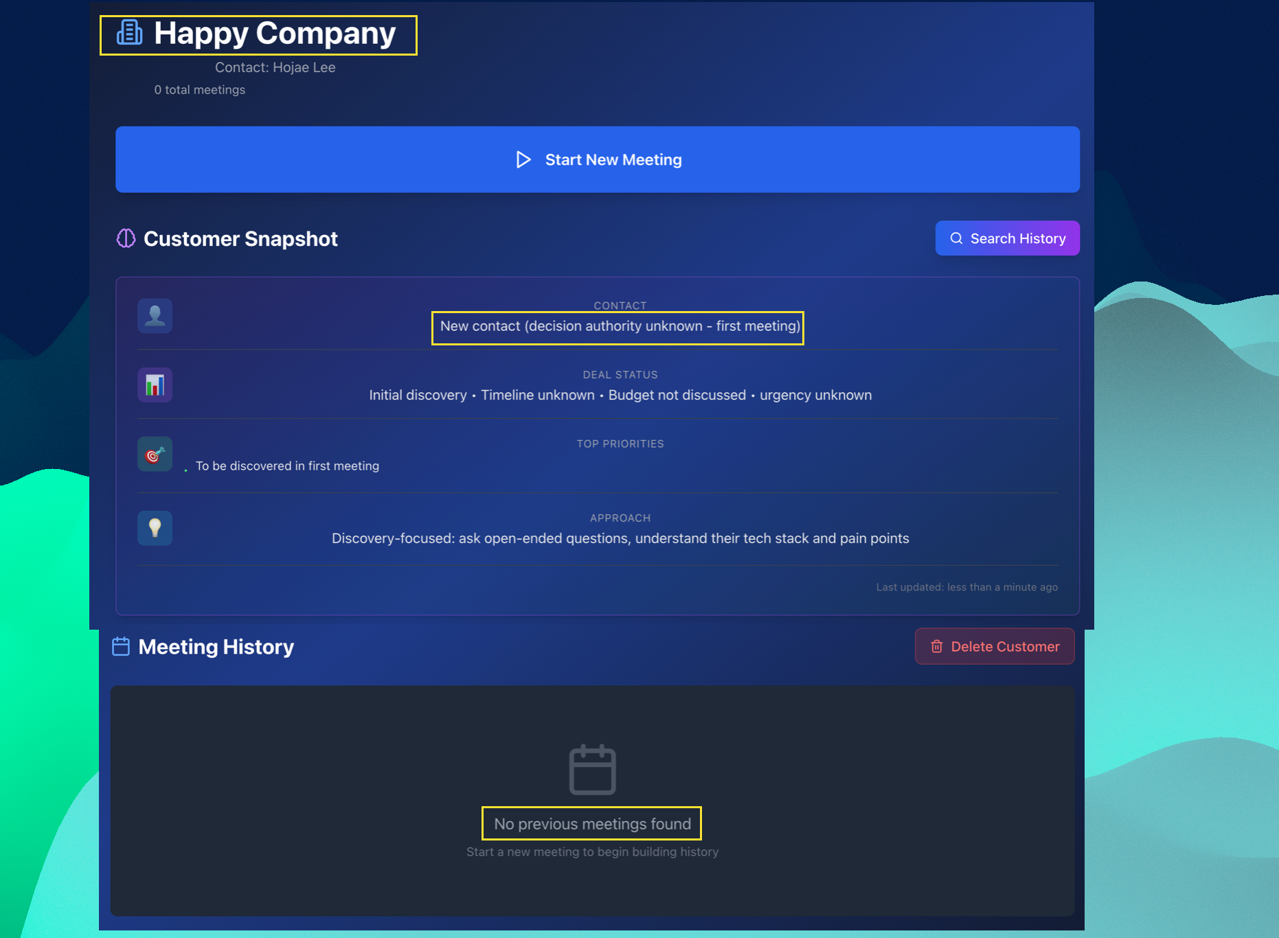 아직 미팅을 한번도 진행하지 않았기 때문에, Customer Snapshot과 Meeting History 모두 고객에 대한 데이터가 없는 것으로 나옵니다.