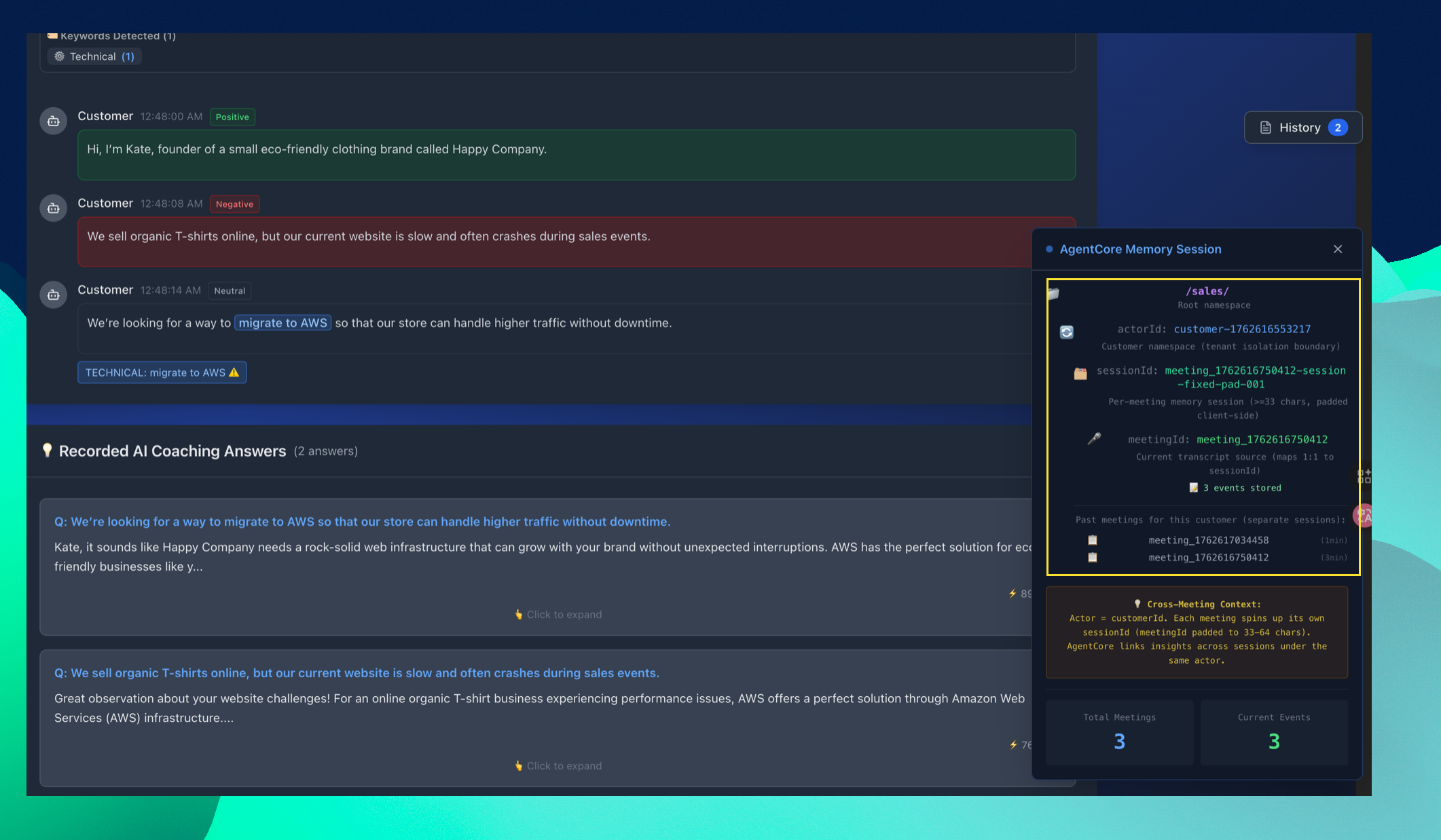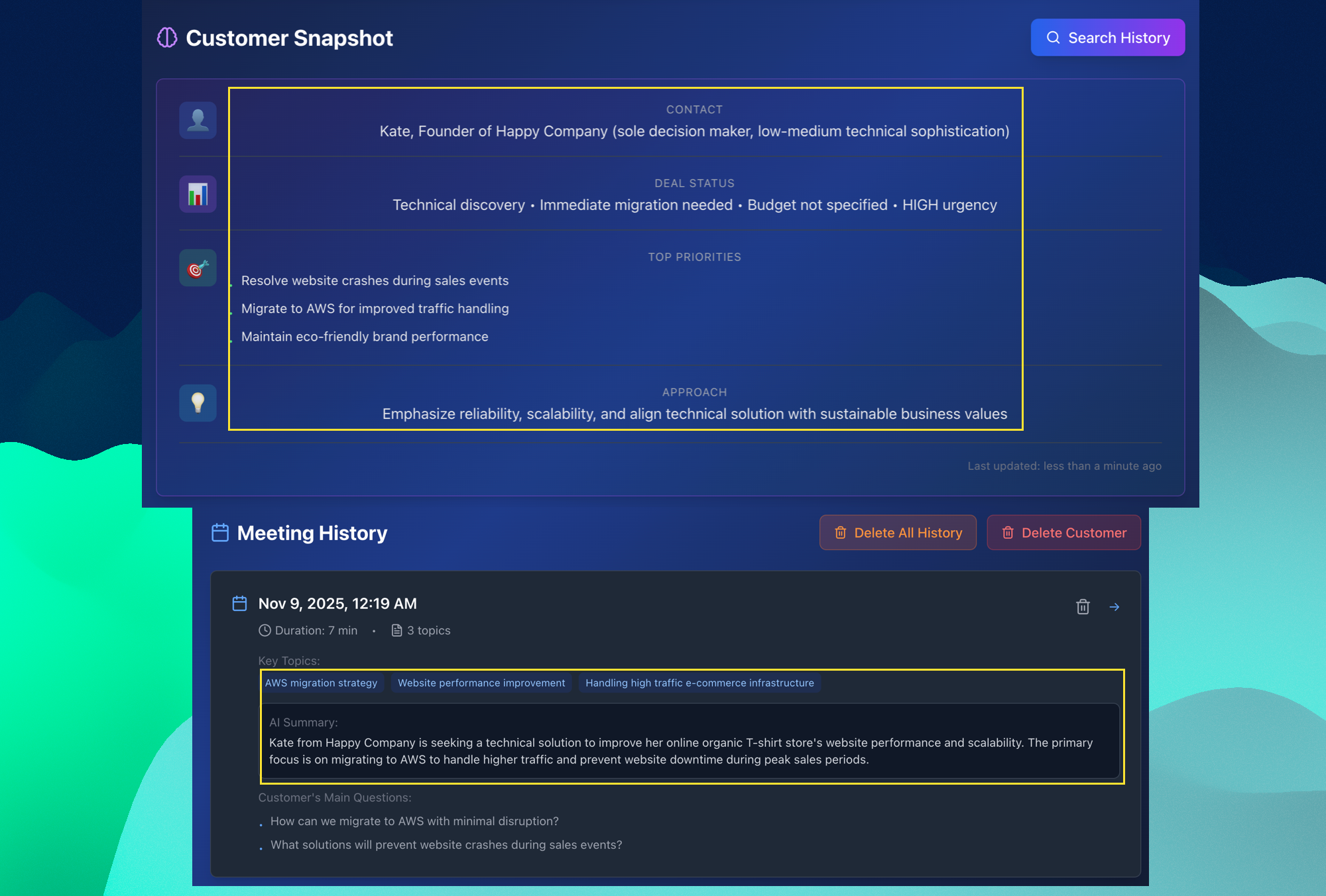여기서 Customer Snapshot은, Long-term memory에 저장된 고객 인사이트를 디스플레이하는 대시보드로 보이고, Meeting History는 Short-term Memory에 저장된 미팅 데이터를 보여주는 곳으로 보이네요.